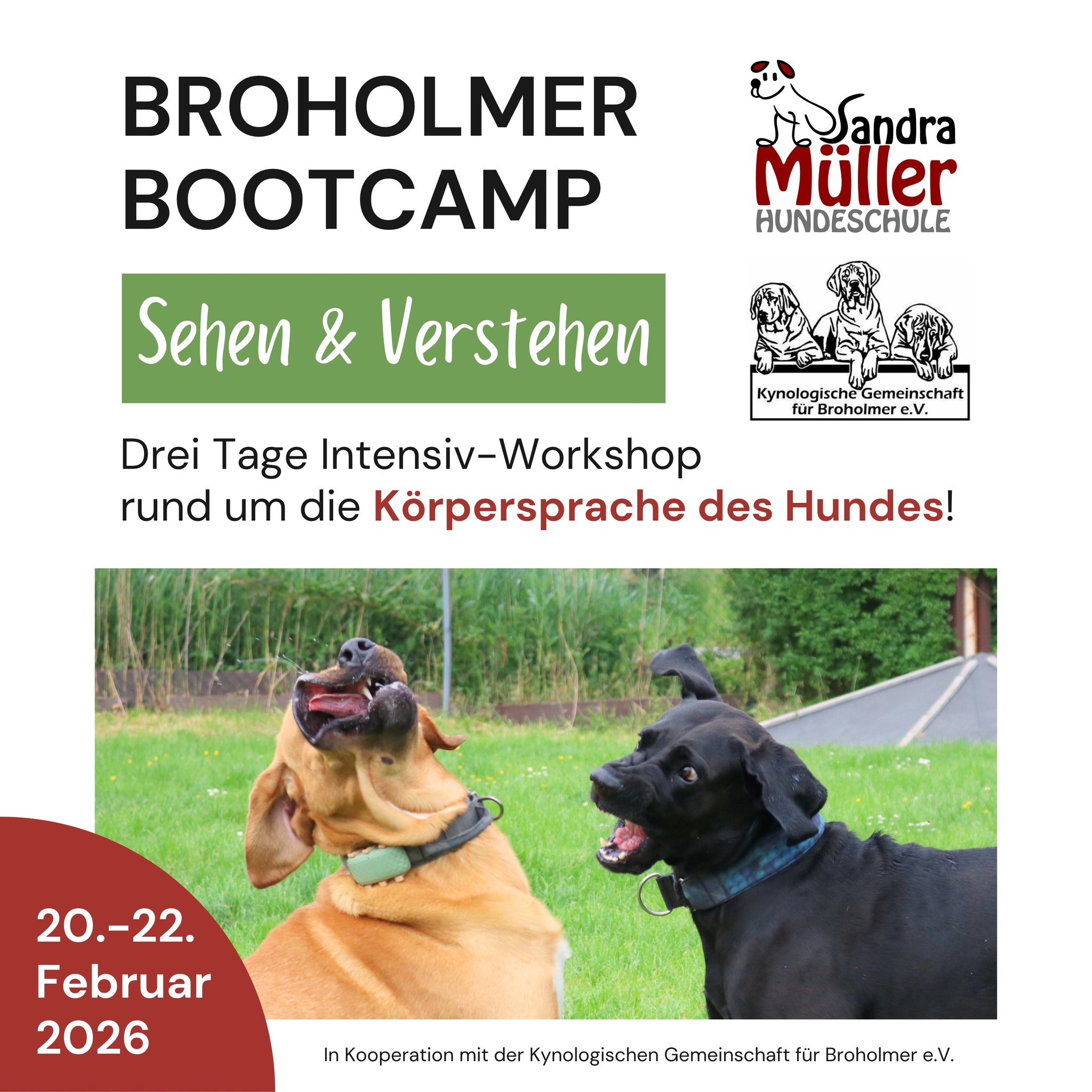 Das Bootcamp für Broholmer(-Besitzer) dauert drei Tage und findet vom 20.-22.02.26 statt. (Start am Freitag: 10 Uhr, Ende am Sonntag: 15 Uhr)